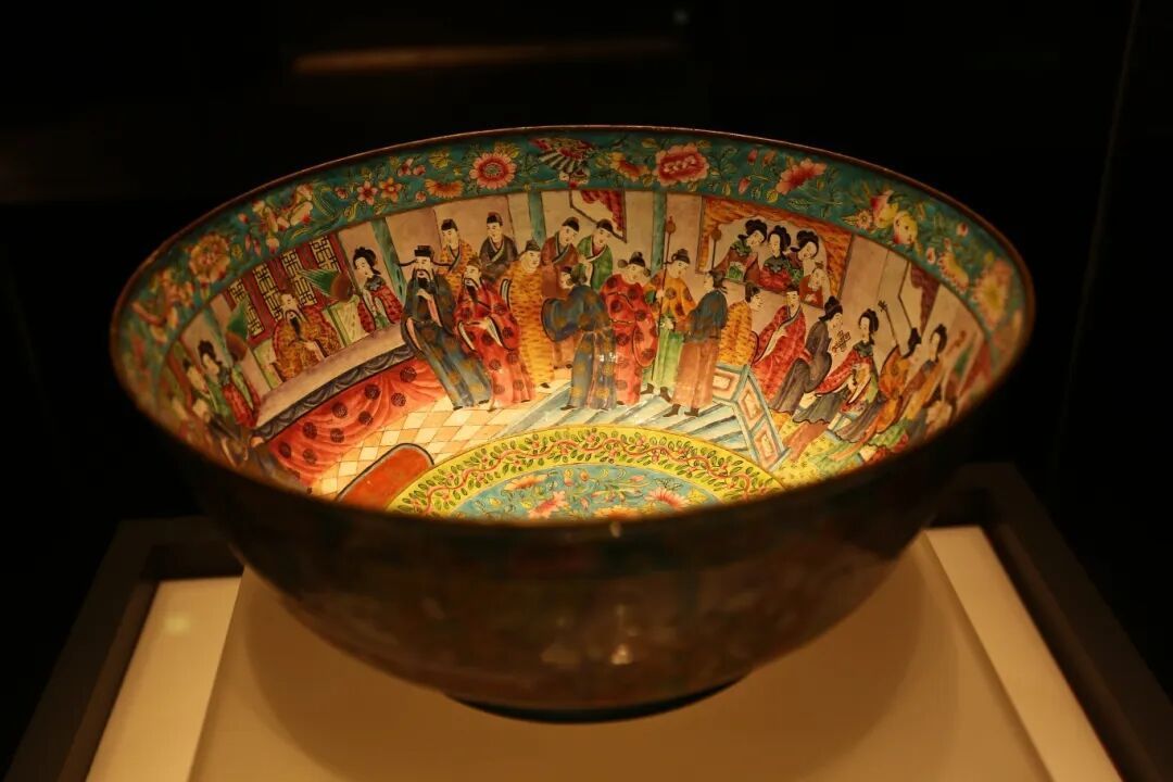 广彩是在西洋“画珐琅”基础上发展而来的独特工艺,全称广州织金彩瓷,始于明代,以色彩艳丽、构图严谨、绘工精细著称。它将织锦图案的手法运用于瓷器之上,宛如金色彩丝织于白玉,极具岭南韵味。有一首诗形象地写出广彩的特色:“彩笔为针,丹青作线,纵横交织针针见,何须锦缎绣春图,春花飞上银瓷面。”